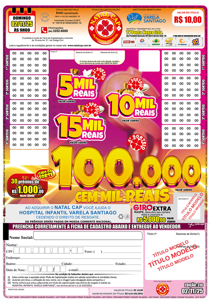 Sorteios decorrentes de Títulos de Capitalização de Pagamento Único, da Modalidade Filantropia Premiável, emitidos pela KOVR Capitalização. Você pode ajudar o HOSPITAL INFANTIL VARELA SANTIAGO comprando o Natal Cap e cedendo o direito de resgate. A aprovação deste Título pela SUSEP não implica, por parte da Autarquia, em incentivo ou recomendação a sua aquisição, representando exclusivamente, sua adequação às normas em vigor. Antes de contratar, consulte previamente as Condições Gerais.